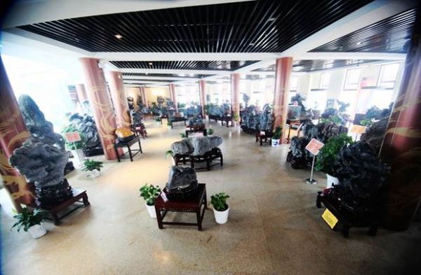 总共4层,底层为钢筋混凝土结构,上面的楼阁为纯木结构,一楼为奇石展厅、二楼为灵璧历代历史文物展厅、三楼、四楼则是它山石、将军石和钟馗画展厅。